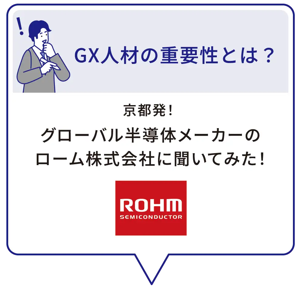 - 転換点を迎えるエレクトロニクスの世界。高性能化だけでなく、環境共生が求められる時代に必要なのが、グリーン×エレクトロニクスを理解し、実践できるGX人材です。ロームでは、省エネ・高効率な半導体技術を通じて、カーボンニュートラル実現に貢献しています。しかし、こうした技術を「どう使えば社会全体のエネルギー効率が上がるのか」「どのように設計すれば環境負荷を最小限にできるのか」といった視点と、幅広い知識、環境意識を併せ持ったエンジニアが必要不可欠です。