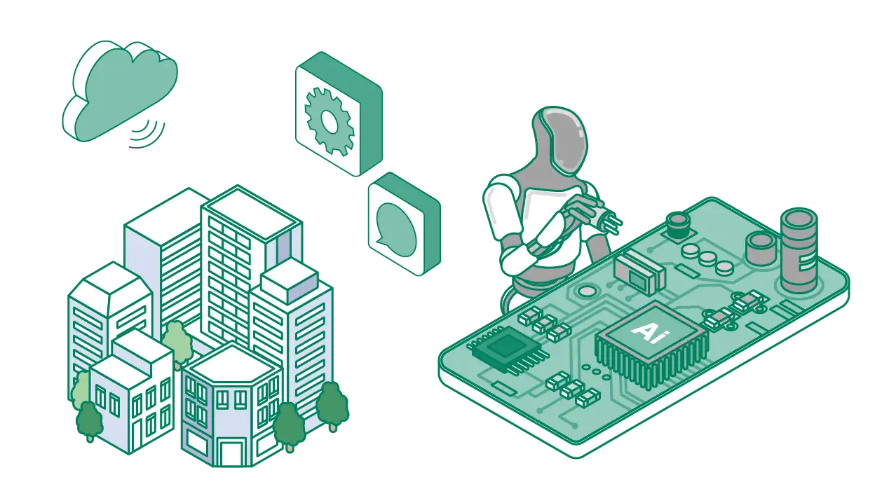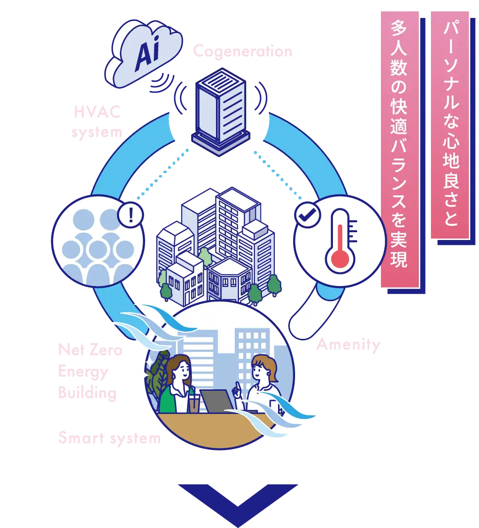 人のいる場所や人数に合わせて、温度や風を送る場所を自動調整するなど、電力システムとAI空調システムの連動も半導体が支えています。より快適かつ、無駄なエネルギーを使わないグリーンな空調システムが、都市エリア全域で細やかに制御され、その空間にいる人全てが快適な未来がすぐそこまで来ています。